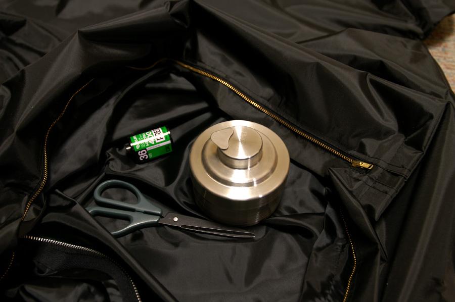 ダークバックにフィルムと現像タンクを入れ、ジッパーを閉じ、手をニュッと突っ込む。