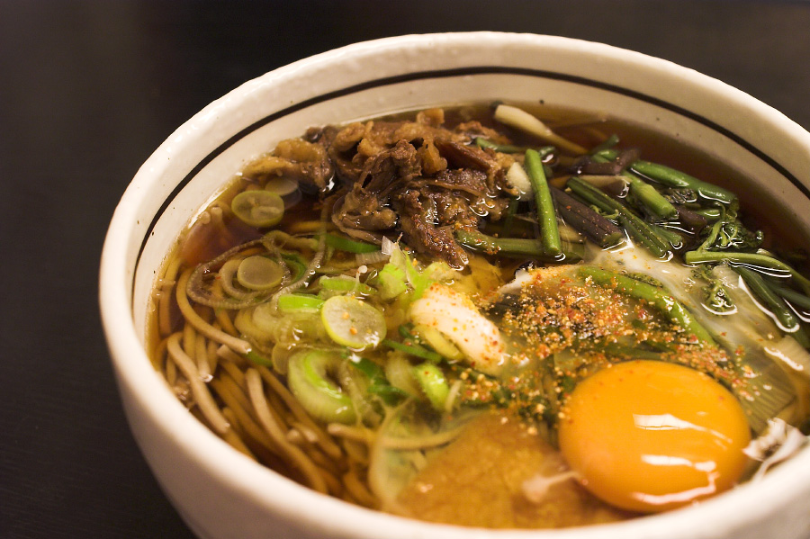 名物の石割そば(420円)は、山菜、牛肉のしぐれ煮、油揚げ、卵が載っている。