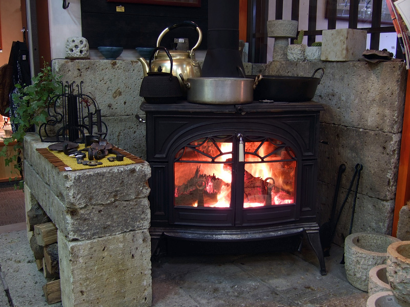 暖かみのある大谷石をあしらった店内では、マントルピースに薪がくべられ